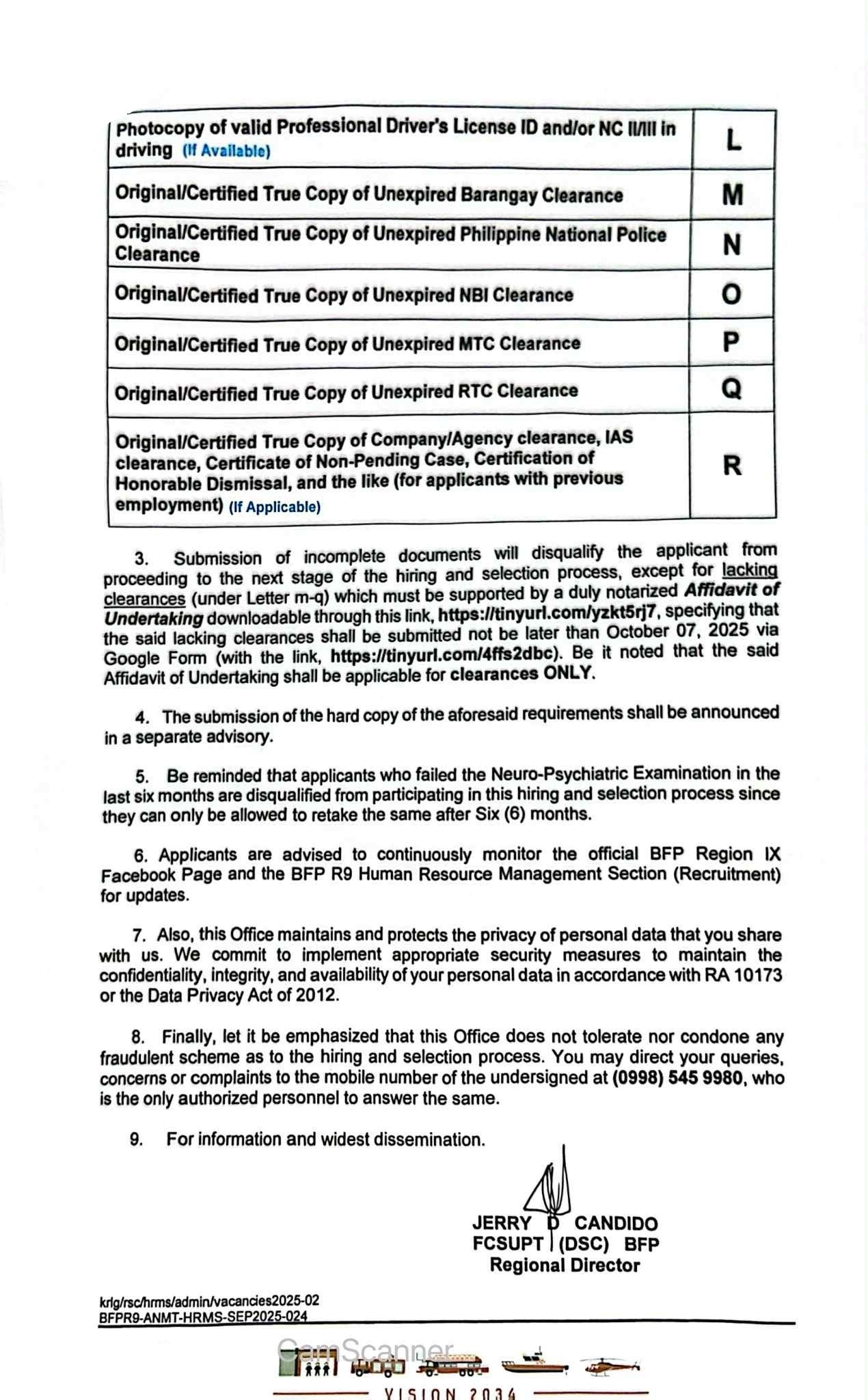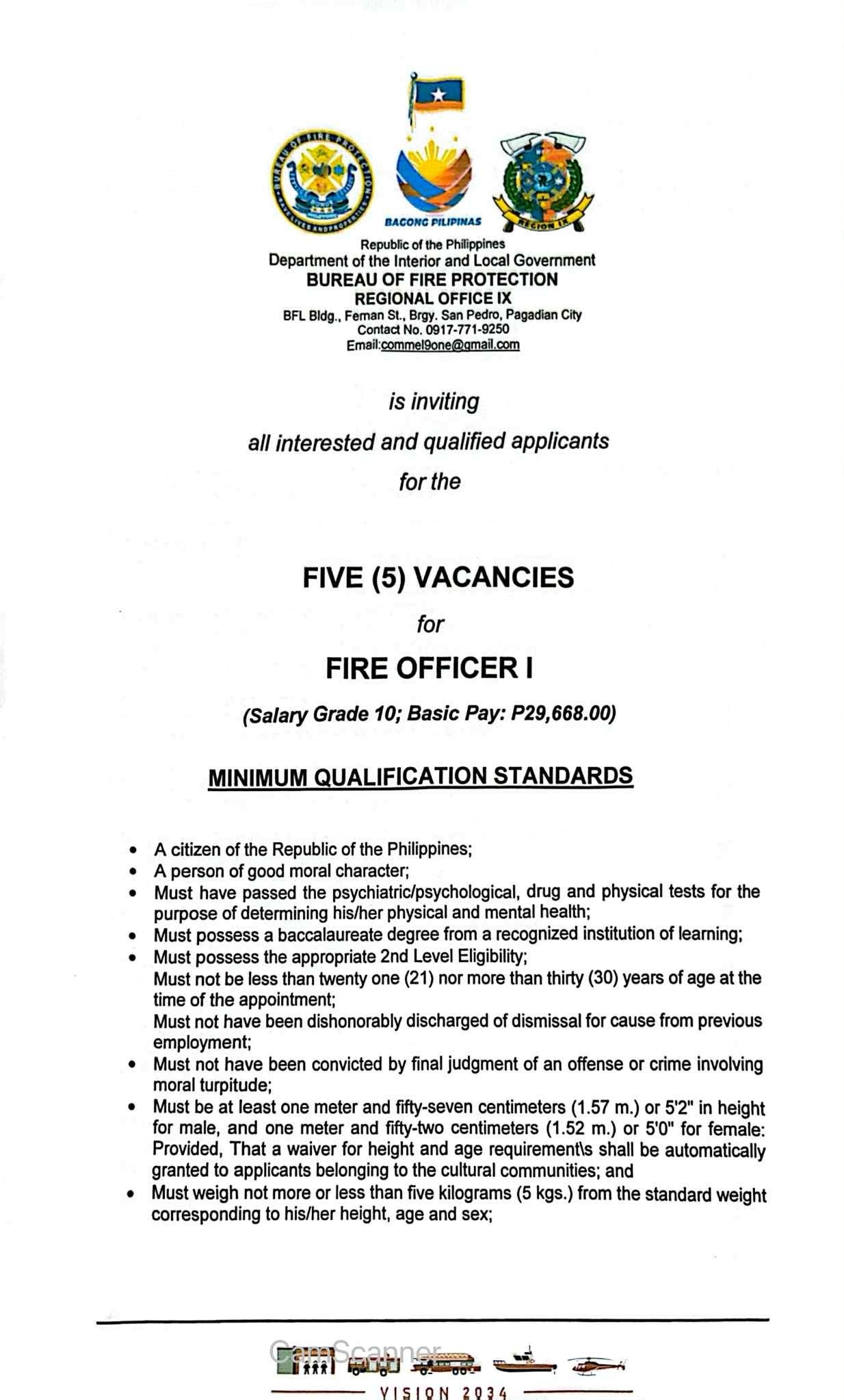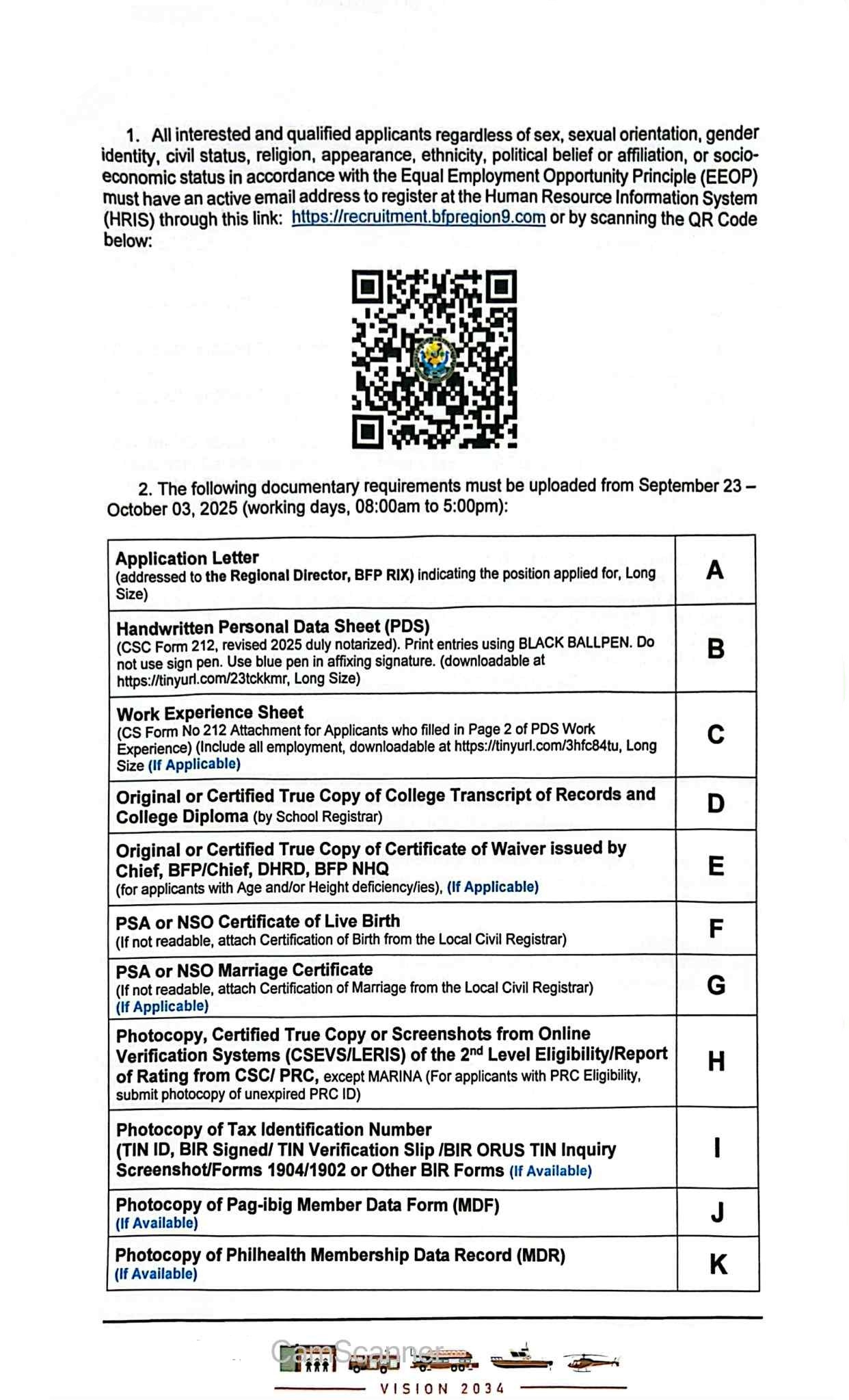 -Application Letter (addressed to the Regional Director, BFP RIX) indicating the position applied for, Long Size, Filename: APL Last Name) A -Handwritten Personal Data Sheet (PDS) (CSC Form 212, revised 2015 duly notarized). Print entries using BLACK BALLPEN. Do not use sign pen. Use blue pen in affixing signature. (downloadable at http://tiny.cc/cpqi001, Long Size) B -Work Experience Sheet (CS Form No 212 Attachment for Applicants who filled in Page 2 of PDS Work Experience) (Include all employment, downloadable at https://tinyurl.com/3hfc84tu, Long Size (If Applicable) C -Original or Certified True Copy of College Transcript of Records and College Diploma (by School Registrar) D -Original or Certified True Copy of Certificate of Waiver issued by Chief, BFP/Chief, DHRD, BFP NHQ (for applicants with Age and/or Height deficiency/ies), (If Applicable) E -PSA or NSO Certificate of Live Birth (If not readable, attach Certification of Birth from the Local Civil Registrar); F -PSA/NSO Marriage Certificate (If not readable, attach Certification of Marriage from the Local Civil Registrar) (If Applicable) G -Photocopy/Certified True Copy/ Screenshots from Online Verification Systems (CSEVS/LERIS) of the 2nd Level Eligibility/Report of Rating from CSC/ PRC, except MARINA (For applicants with PRC Eligibility, submit photocopy of unexpired PRC ID) H -Photocopy of Tax Identification Number (TIN ID, BIR Signed/ TIN Verification Slip /BIR ORUS TIN Inquiry Screenshot/Forms 1904/1902 or Other BIR Forms(If Available) I Photocopy of Pag-ibig Member Data Form (MDF) (If Available) J -Photocopy of Philhealth Membership Data Record (MDR) (If Available) K -Photocopy of valid Professional Driver's License ID and/or NC II/III in driving (If Available) L -Original/Certified True Copy of Barangay Clearance M -Original/Certified True Copy of Philippine National Police Clearance N -Original/Certified True Copy of NBI Clearance O -Original/Certified True Copy of MTC Clearance P -Original/Certified True Copy of RTC Clearance Q -Original/Certified True Copy of Company/Agency clearance, IAS clearance, Certificate of Non-Pending Case, Certification of Honorable Dismissal, and the like (for applicants with previous employment) (If Applicable) R
